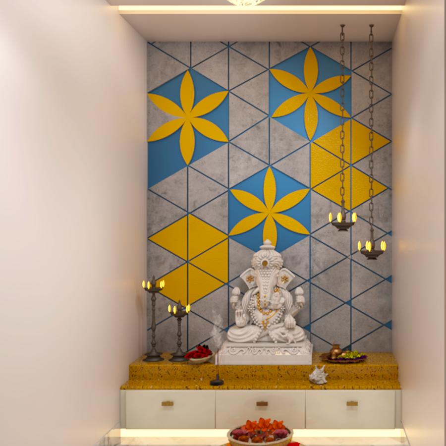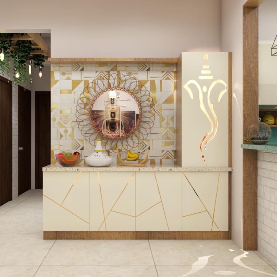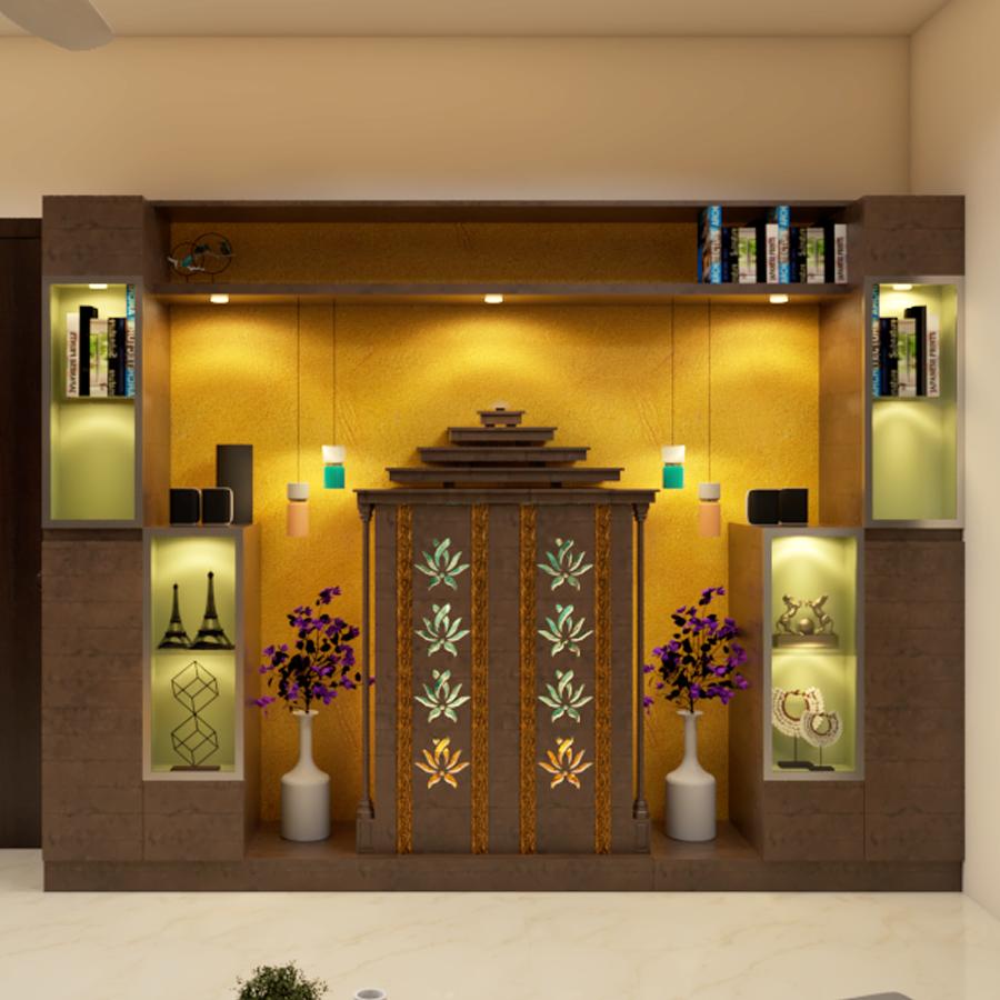 The altar, shelves and backdrop need to be designed keeping in mind the idols and photo sizes of the deities. Arrange the idols or images with care, placing the main deity in the center. Consider adding symbols or representations of other deities or spiritual elements that hold significance for the inhabitants of the space.
