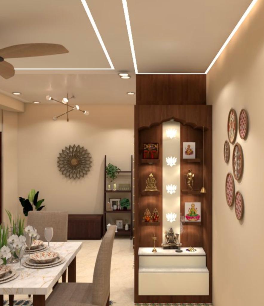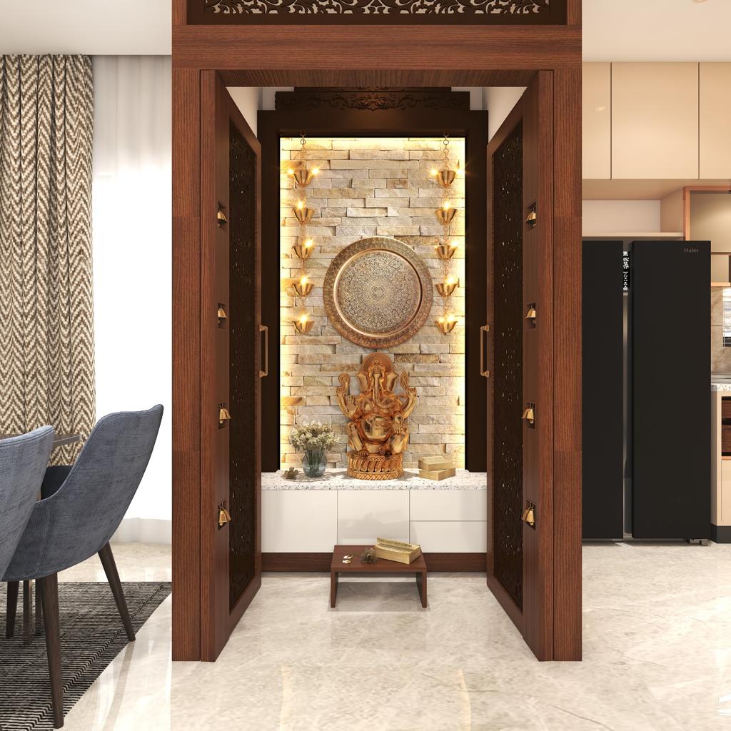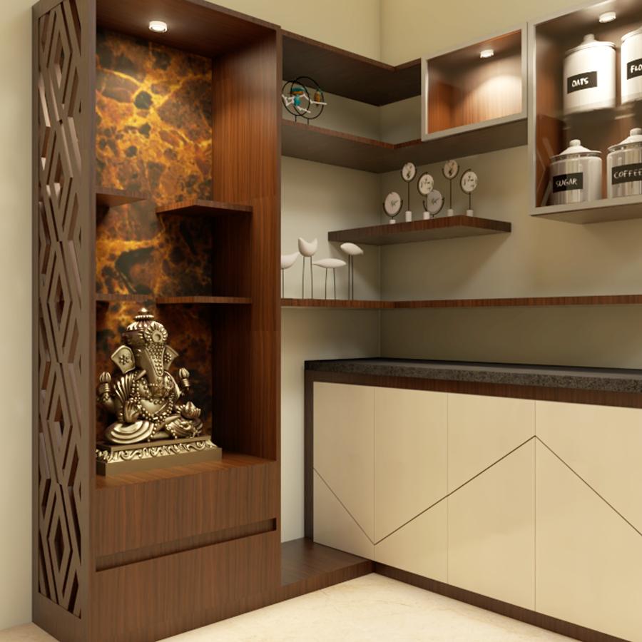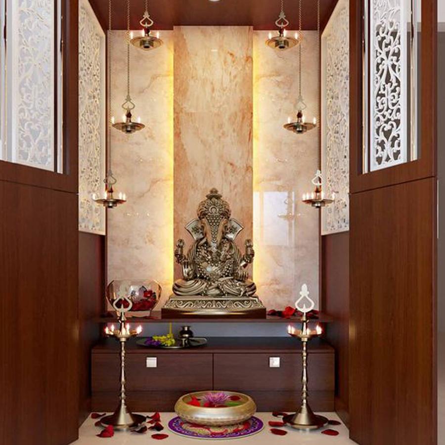 The puja altar height needs to be designed keeping in mind the style of prayers performed, the age of the inhabitants who would be using the space the most. Ensure it is at an appropriate height and easily accessible for offering prayers.
